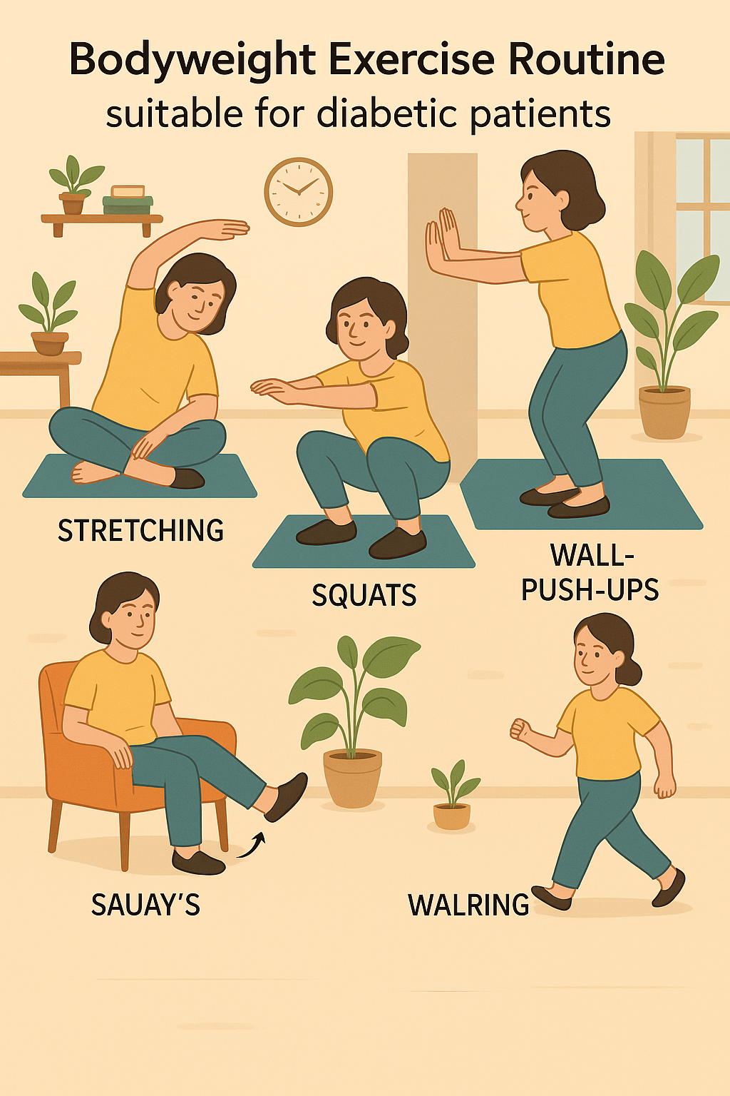 - 화·목: 유산소 + 스트레칭 (빠르게 걷기, 요가, 태극권 등)