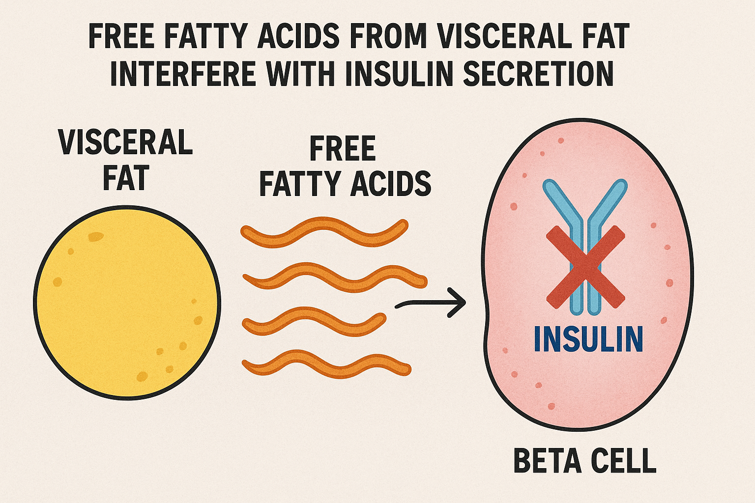 내장지방에서 유리된 지방산(자유지방산, FFA)은 혈액을 통해 간과 췌장, 근육 등 주요 대사 기관으로 이동하여 인슐린 분비와 작용을 방해합니다. 다음과 같은 주요 메커니즘이 확인되어 있습니다.1. 인슐린 신호전달 방해 및 인슐린 저항성 증가내장지방이 과다하면 FFA가 대량 방출되어 혈류 농도가 증가합니다.이 FFA는 간, 근육, 췌장 등 조직의 인슐린 신호 전달 경로를 방해하여 인슐린 저항성을 직접 유발합니다.FFA는 인슐린 수용체 이후 단계의 신호전달(IRS-1/2, PI3K, Akt 등)을 저해해 포도당 흡수 및 저장 과정이 제대로 이뤄지지 않게 만듭니다.결과적으로 인슐린이 분비되어도 혈당 조절 능력이 떨어지고, 베타세포가 더 많은 인슐린 분비를 요구받아 기능이 저하됩니다.2. 췌장 베타세포에 대한..